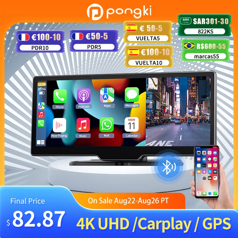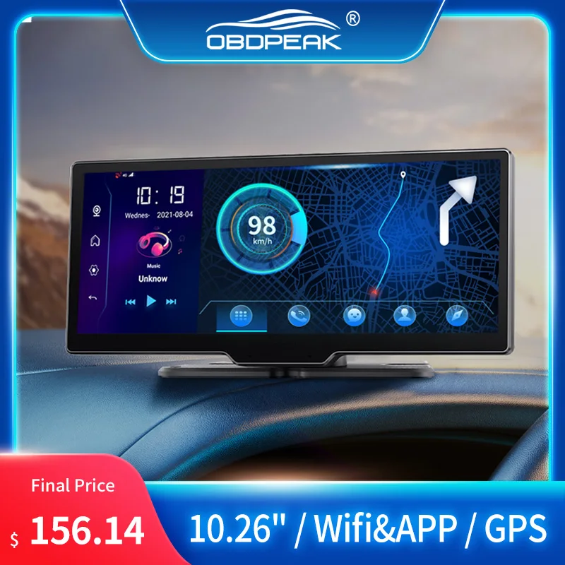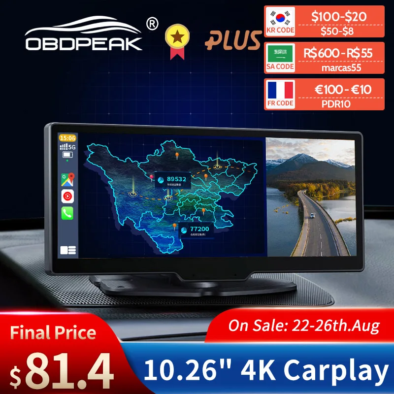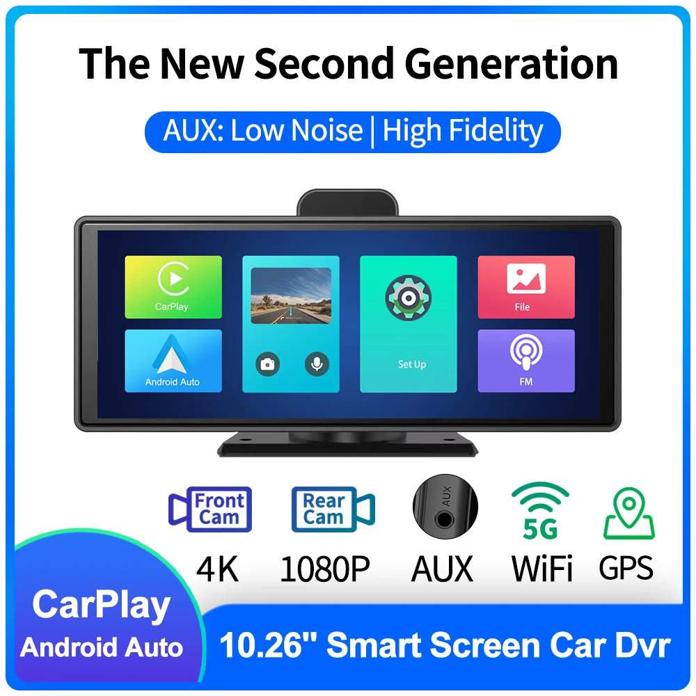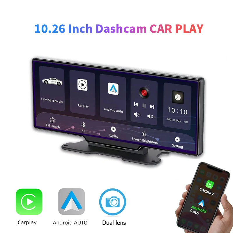 애플 카플레이 자동차 무선 멀티미디어 플레이어, 10.26 인치 터치 스크린, 4K, 안드로이드, 라디오, GPS, 듀얼 렌즈, 대시 캠, 1080P, 스테레오, Linu