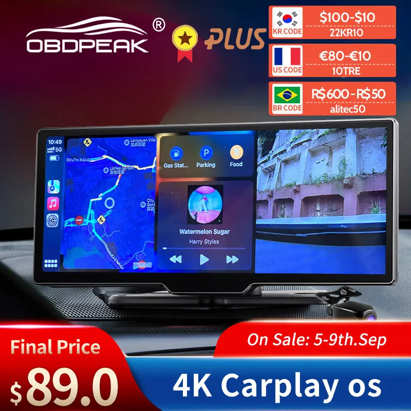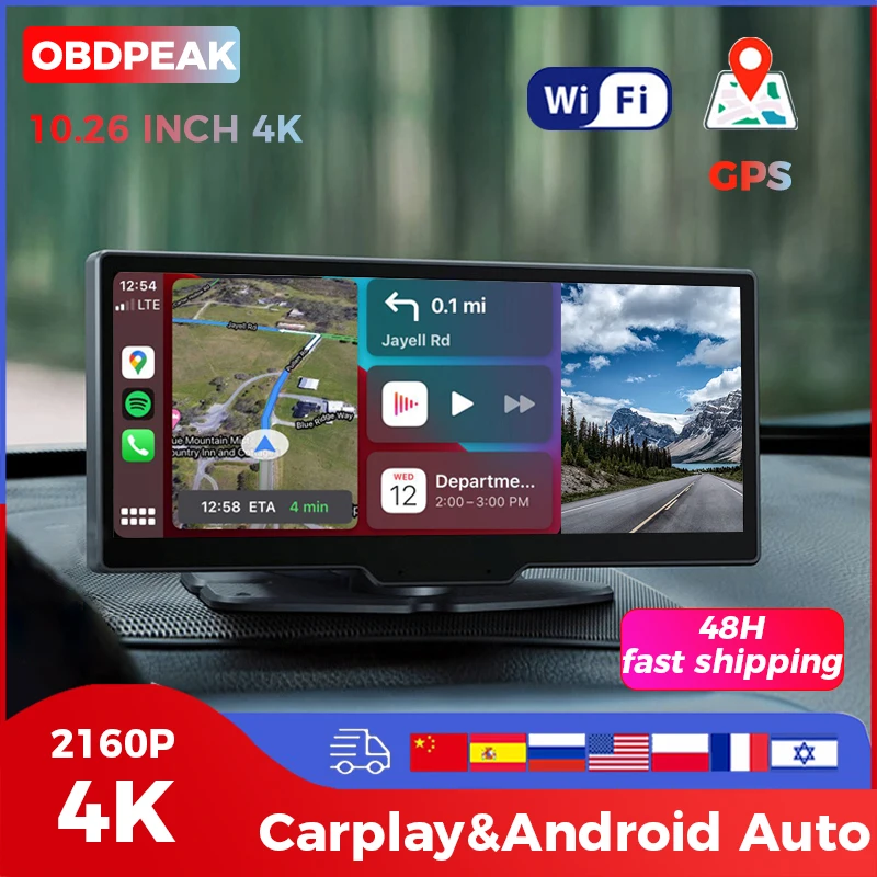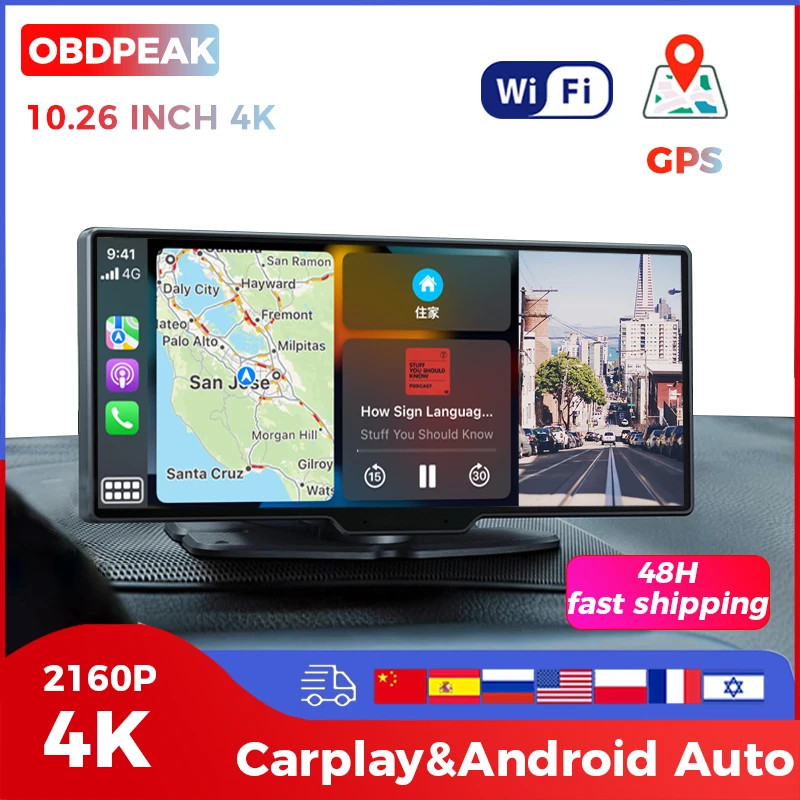 OBDPEAK K2 10.26 인치 자동차 DVR 4K 3840*2160P GPS 카플레이 및 안드로이드 자동 대시 캠, 대시 보드 GPS 네비게이션 5G 와이파이 운전 레코더